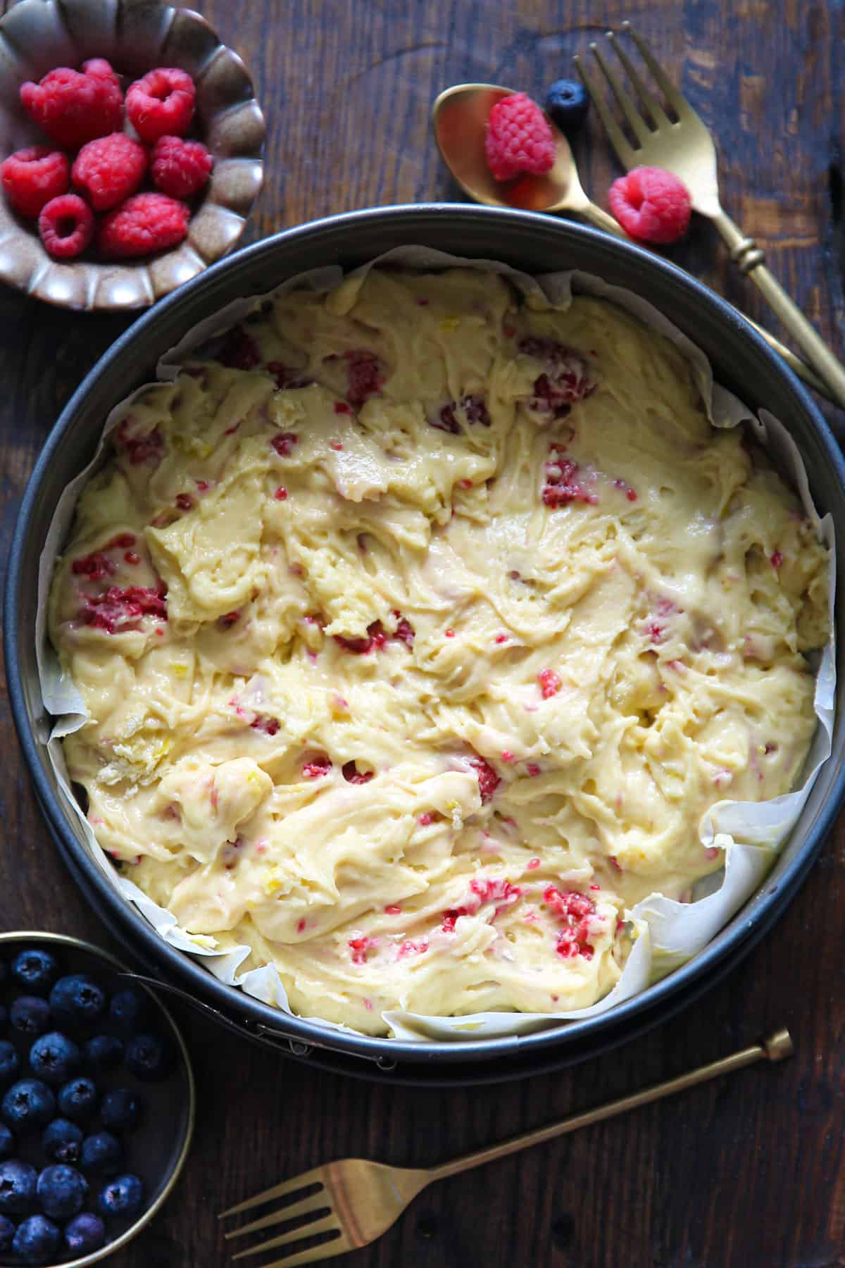 - Arrange the remaining 1/3 of raspberries on top of the batter in a circular pattern.