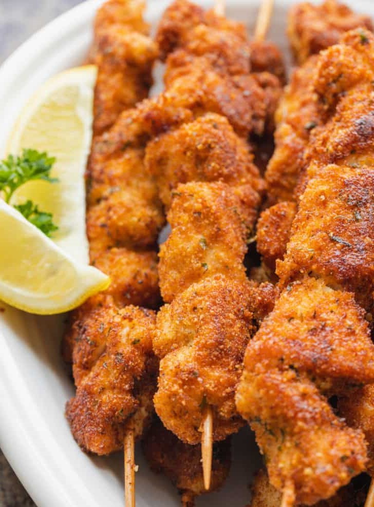 - Coat in breadcrumbs: Pour breadcrumbs onto a plate and roll chicken skewers in the breadcrumbs until evenly coated.
