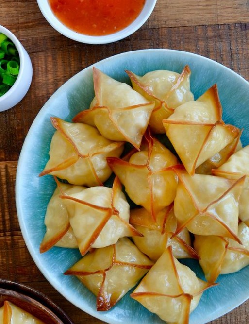 Ingredients: 1 (8-ounce) package cream cheese, at room temperature 1 1/2 teaspoons minced garlic 1 tablespoon chopped scallions 1 tablespoon low-sodium soy sauce 8 ounces lump crab meat 22 wonton wrappers Cooking spray Sweet and sour sauce or Chinese mustard, for serving Optiona…
